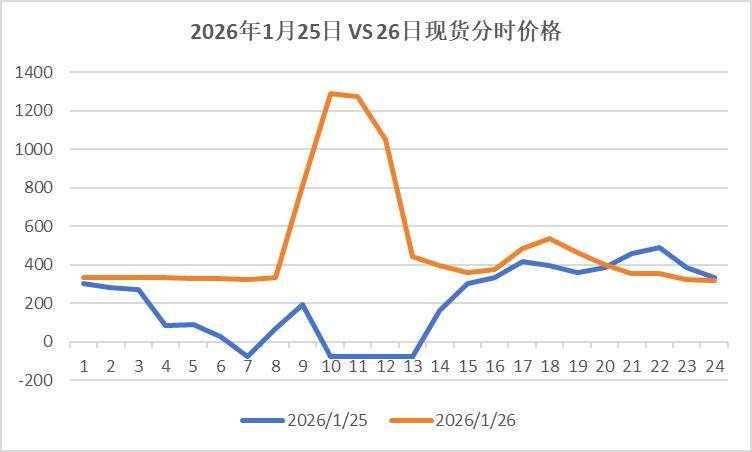 下面展示了一家企业1月25日(蓝色)和1月26日(橙色)连续两天的电网用电情况(为方便对比,我将两天非光伏出力时段的用电修正为一致,保留了白天真实的用电量);另一图是山东省现货实时分时价格。