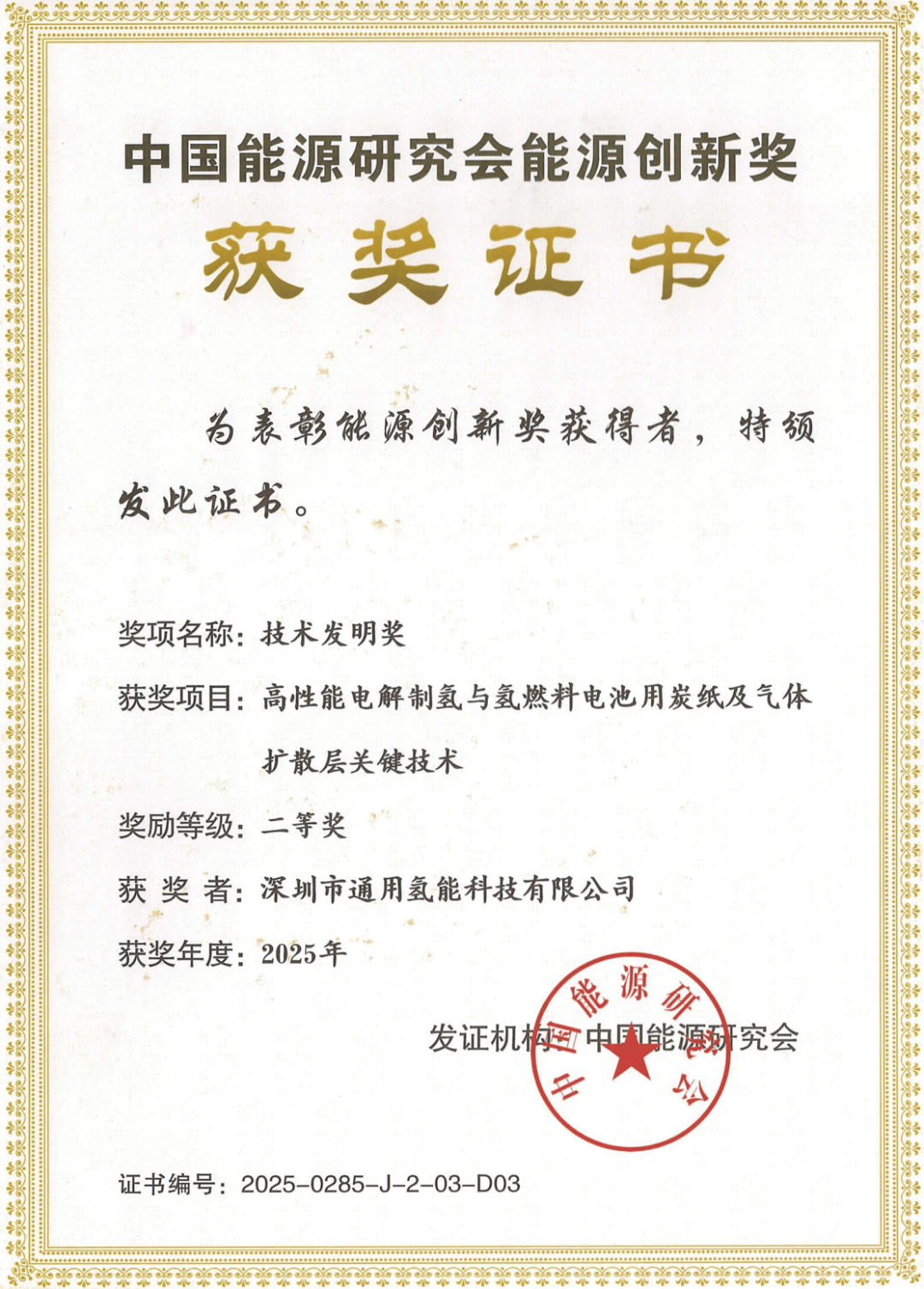 近日,深圳市通用氢能科技有限公司申报的“高性能电解制氢与氢燃料电池用炭纸及气体扩散层关键技术”项目荣获2025年度中国能源研究会技术发明奖二等奖。