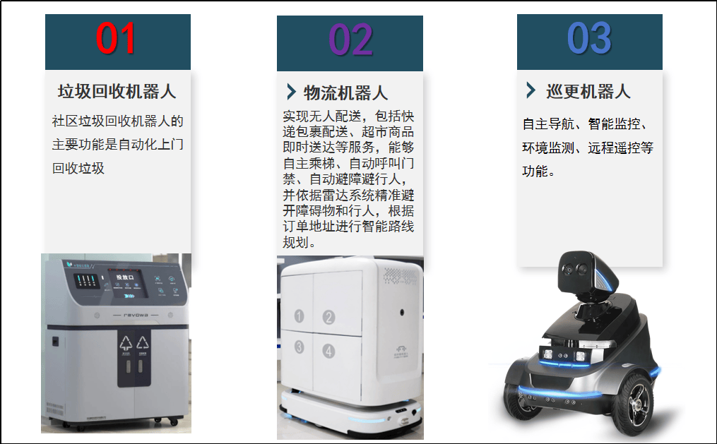 构建“无人机+AI机器人”智能配送生态应用于房地产项目,联合航空合作伙伴打造“空-地一体化”立体物流网络,推动低空经济与人居服务场景深度融合,完成社区级“最后一公里”配送;结合地面物流机器人实现“停机坪-单元门”精准送达,业主只需一键预约便可实现物流配送到家,重新定义社区物流效率标准。在本项目展示区中应用物流机器人、巡更机器人、垃圾回收机器人、清洁机器人、消毒机器人,大区中应用物流机器人、垃圾回收机器人。推动物业服务向“零接触、零误差、零碳排”升级,实现智慧城市服务与社区运营的深度融合。